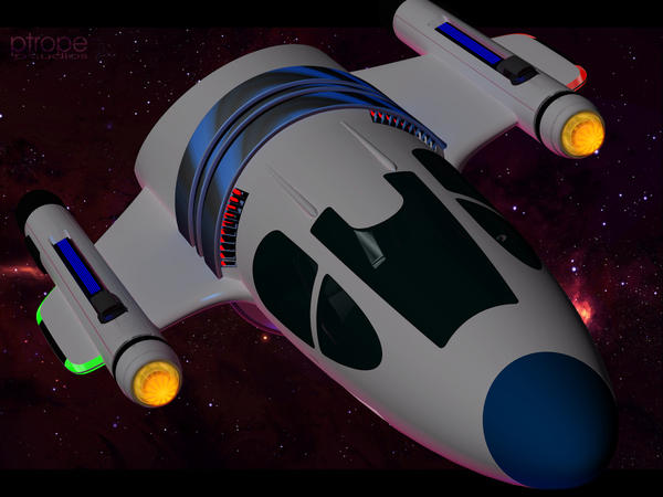 Ptrope's "Dart" vehicle makes a great StarFleet courier! Without having to touch the geometry, Because he gave it it a large number of material zones, I was able to turn the central stabilizer invisible without having to alter the base geometry file. I can even "hide" the wings in the same manner. I mounted GreyWolf StarKiller's warp nacelles to the wings, turning the Dart into a kind of StarFleet Lear jet.