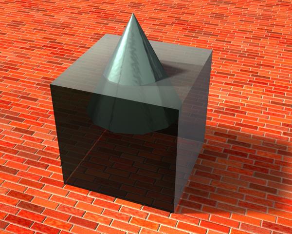 Metal cone inside translucent gelatinous cube on brick plane drop.
