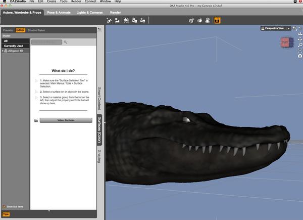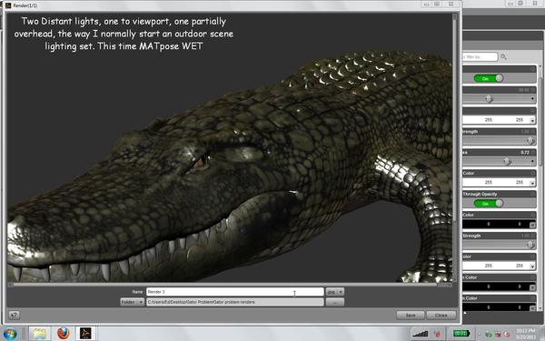 I don't know if this applies to your gator, but I have noticed that product textures originally designed for Poser do better in UE2, in that they are designed for IBL lighting, and so usually show up way too dark in Daz-default, and can be non-responsive to surface changes. I've also noted that artist/venders who offer genuine "Daz" versions generally rework the textures in a Daz-specific way so they look fantastic in ordinary, Daz-default renders, too. Flink is a good example.