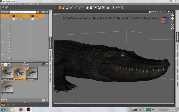 When a Daz format gator is loaded, it appears with textures in place while loading; the eyes, teeth etc. are all there, but once the model is fully loaded, the textures disappear. I f I reposition that first one, and load a second gator, the same thing occurs, except that after loading the second, the first on moves back to the zero position, covering up the second model. That's not at all helpful in scene setups, when the model I've carefully placed reverts to zero as soon as I load another. There are easy-enough workarounds, but it's still a obstacle that has to be dealt with.
