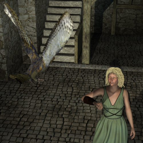 Darkened the area behind her, but left the rest light. Shadows became very dark and ugly and well, I think it draws the eye to whatever it is she's looking at (I'll post a pic that does include the owl at some point, don't worry, I just have to actually render it ;)). *Something* is happening up there and she sure finds it interesting enough to give it a smile.