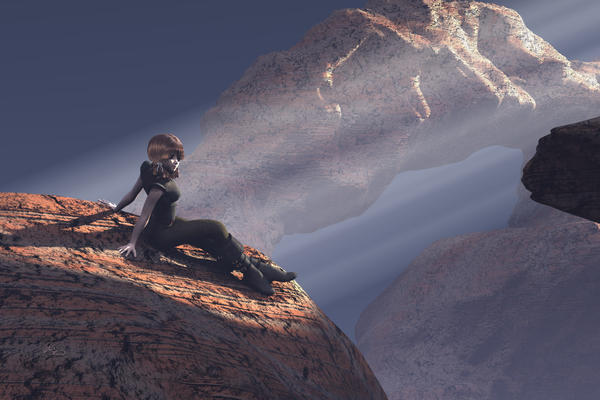 Bryce, no pp. Hitomi is from DAZ 3D. The arches come with Bryce and were made by Clay Hagebush. The rays are the Streaming Rays material, a free resource from Frozencry (Denny Markovic) available at bryce5.com. Main light by the Bryce sun, ambient light by the Stoneheap Sky Dome HDRI which also supplies the cloud.
