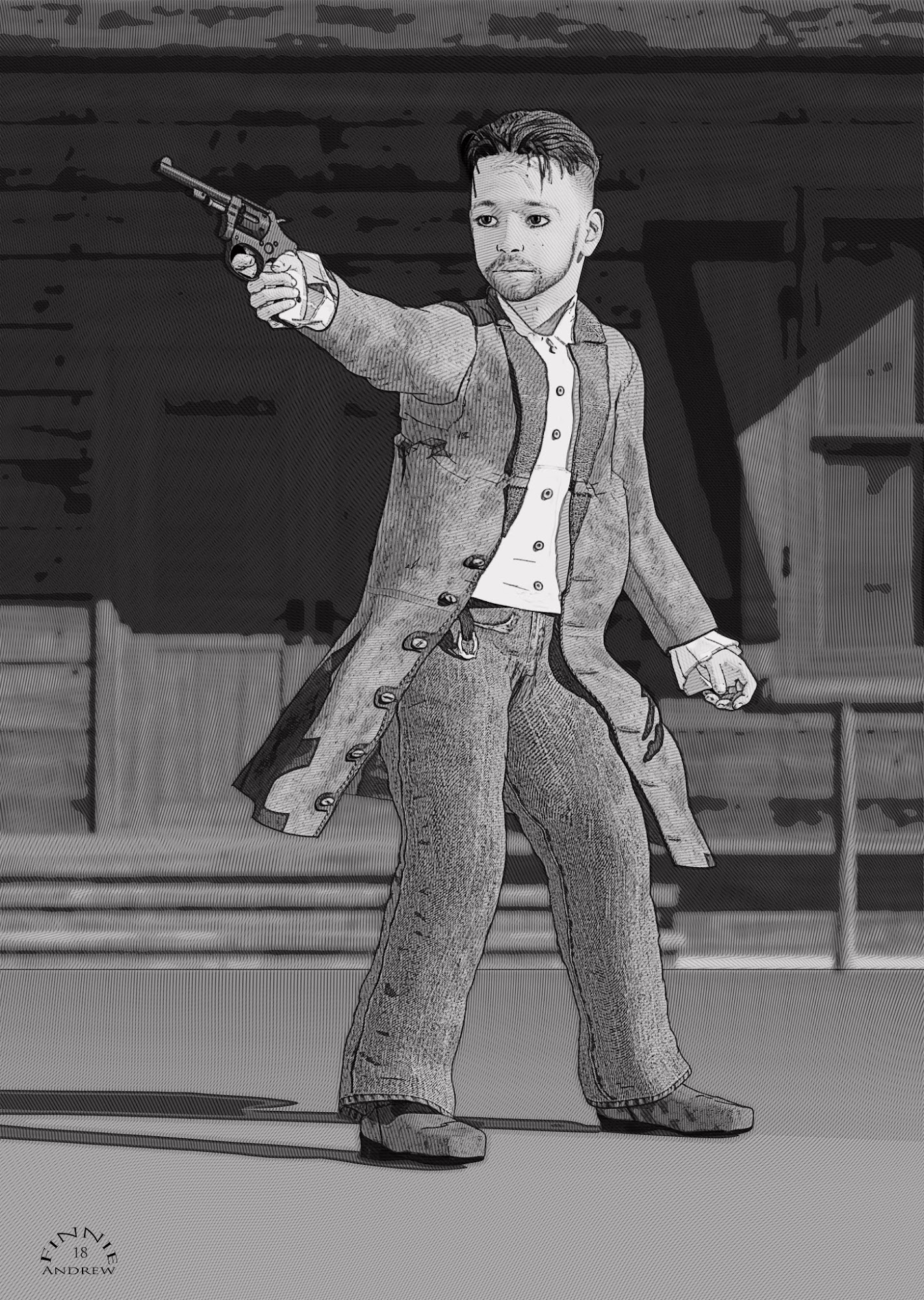 Very nice work, all around (and I'm a big fan of Westerns). This one, though, is a bit too dark. Perhaps a key light on his body to outline him would add to the menace of his presence? Just a thought.