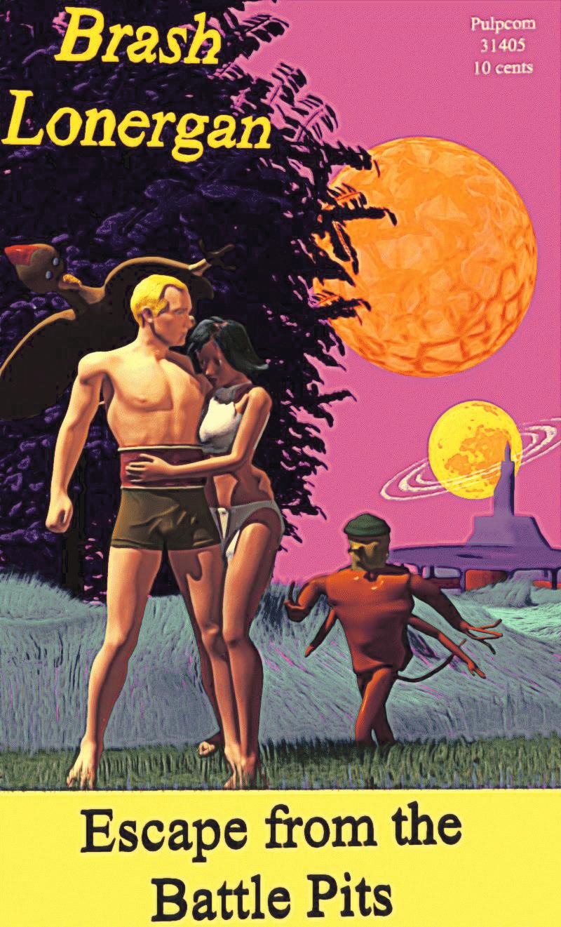 I really like this style. It looks like something lifted from an old pulp novel. There's a little funkiness around his shoulder/armpit, but that's a minor point. I think it's more of the way the lighting is hitting his skin more than a problem with the anatomy. I really like the pink sky and the comic alien in the background. This is just the sort of thing I would have devoured in my teens.