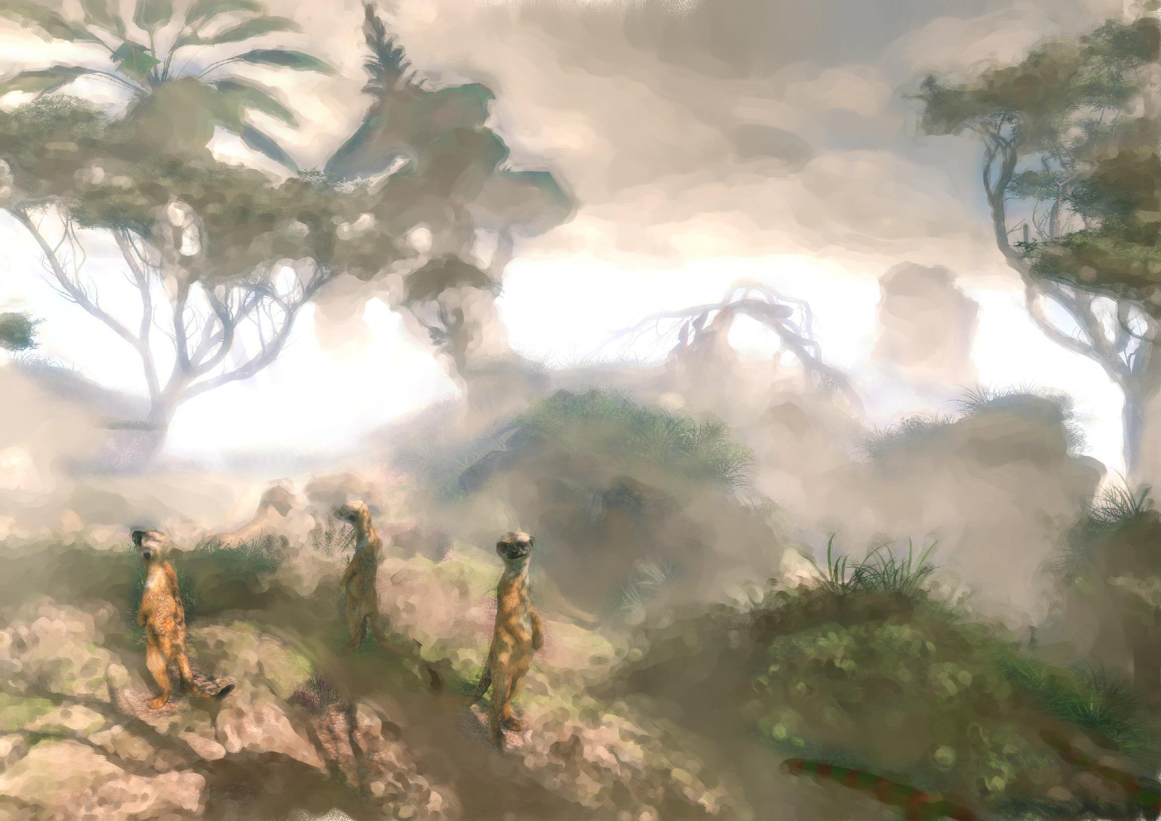 This would look fantastic at a large size in a gallery. And it looks really cool and interesting when viewed full size. But shrunk down, I could barely tell those were meerkats. There is something almost haunting about the colors, though, and they remind me simultaneously of Frazetta's backgrounds and some of the impressionists (a hint of Monet, but just a hint – i've been reading a book on impressionism lately and this really strikes a chorde with me, but I cannot nail down who this reminds me of the most). Cool stuff, and the lighting is really fantastic here.