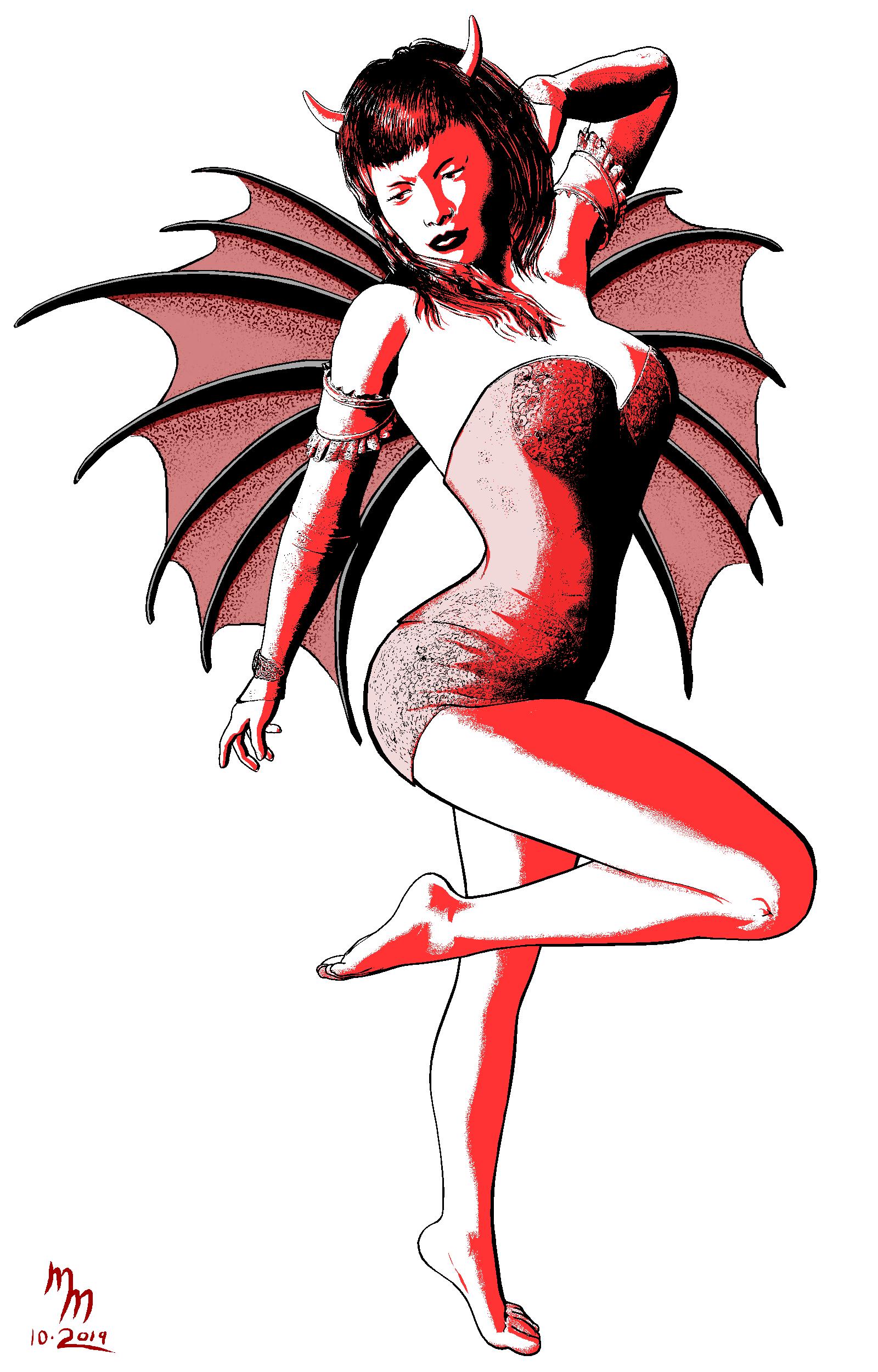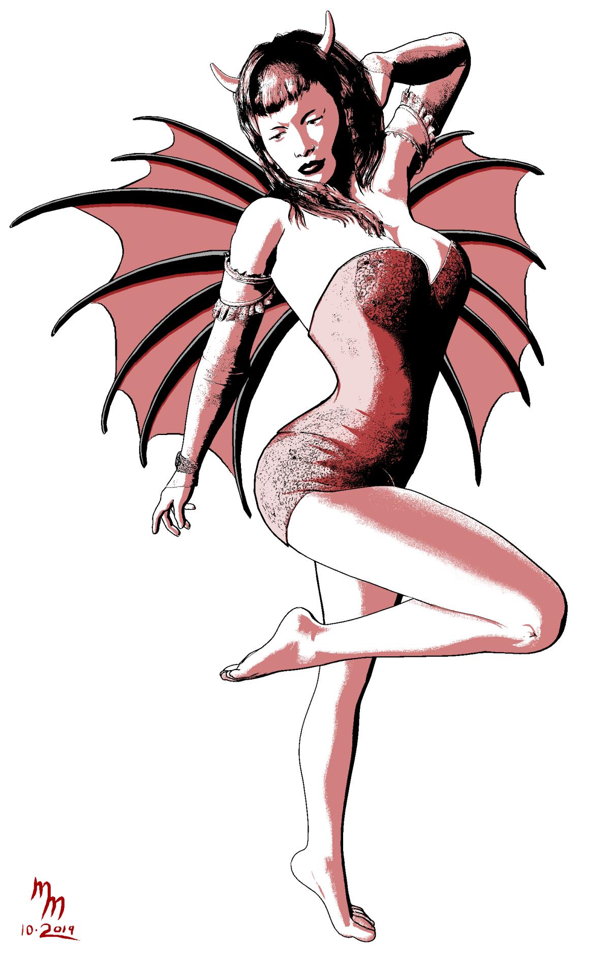 Here's the update of my pin-up. I wound up playing around with the colors (a lot) and finally settled on this combo of red and a "dusty rose" color. Significant fixes to the hair (I also edited out her earring from the earlier one because I didn't think you could "read it" through all the hair). As before, this is Victoria 4 rendered in Poser Pro 11 and cleaned-up in Clip Studio Paint. Honestly, I spent WAY too long on this considering it's just a character sketch. I've got to add her to the illustration I'm working on and try to get it done in time.