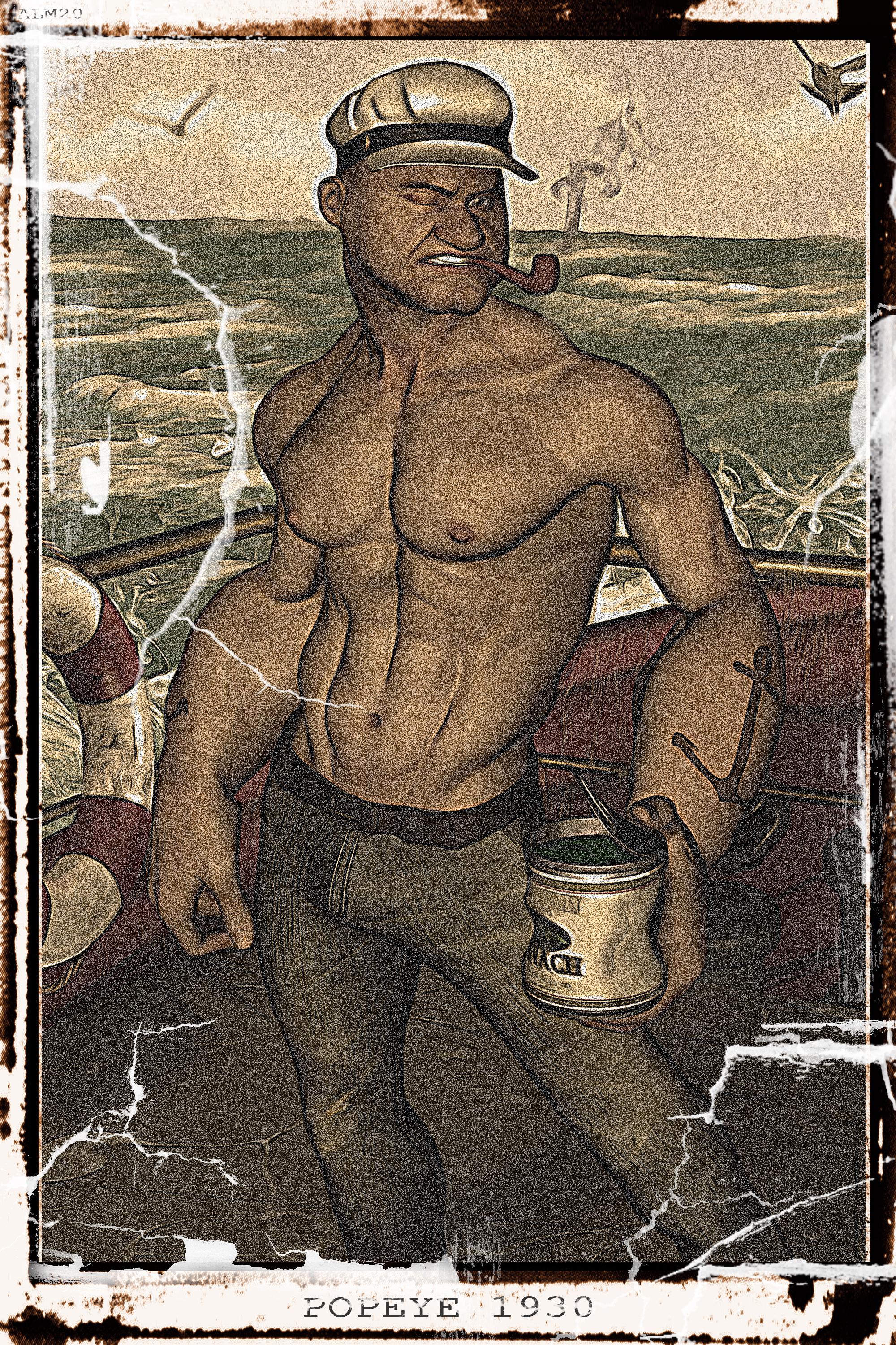As for the clothes, I was trying to achieve the most iconic look from the cartoons. Surprisingly all the Popeye characters have a number of different outfits that they appear in, but I thought the black and red would be the most recognizable. But since you want to see his muscles better I'll show you the shirtless variant I did at the same time.