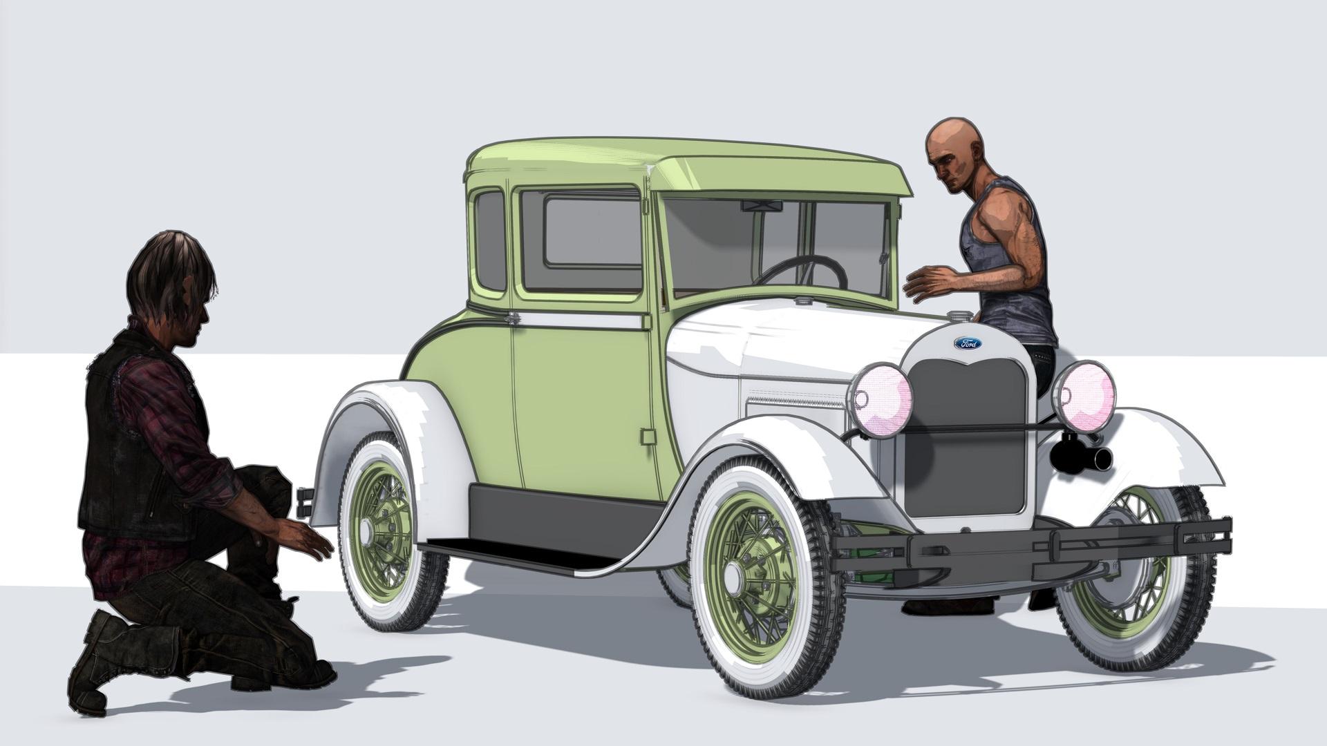 The car is fantastic. The lines are great. I'm going to suggest something that movie set directors talk about: heroic scale. Even though everyone is to scale, in an illustration (or movie) this car looks just a little big, making the heroes look small. I would suggest shrinking the car about 10% (or making the people taller by same amount) to give them a little more presence.