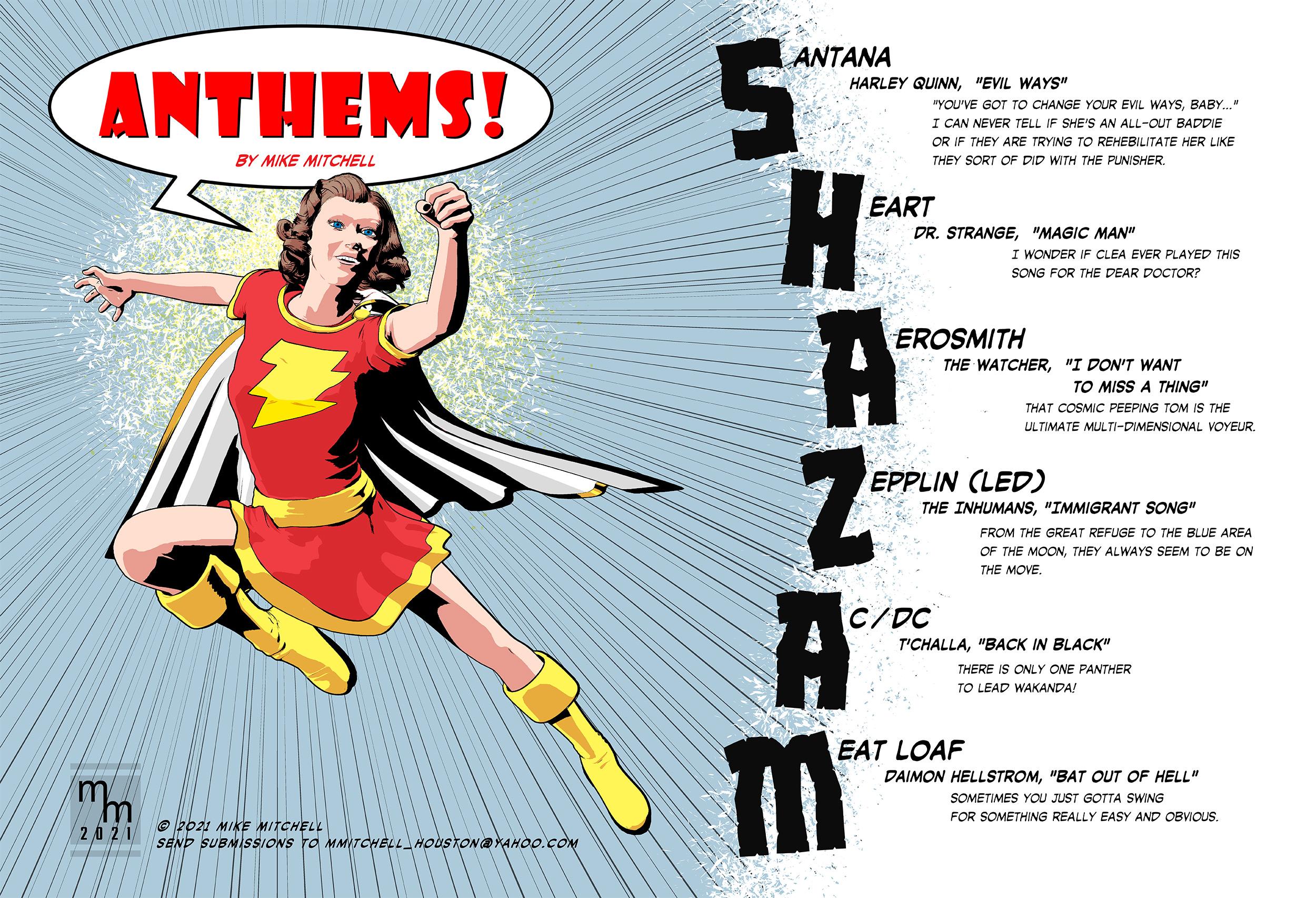 This is a 2-page spread for a fanzine (the Collectors' Club Newsletter -- look for us on Facebook if you're interested in learning more or joining). "Anthems" is a feature that pairs superheroes and music. It's a silly thing, really, but fun. This issue I decided to tap into the power of SHAZAM and list one song for each letter of the magic word. As you can see, I chose a mostly classic rock theme. BTW, you should listen to the songs in order that they're listed; they make for a decent little playlist.