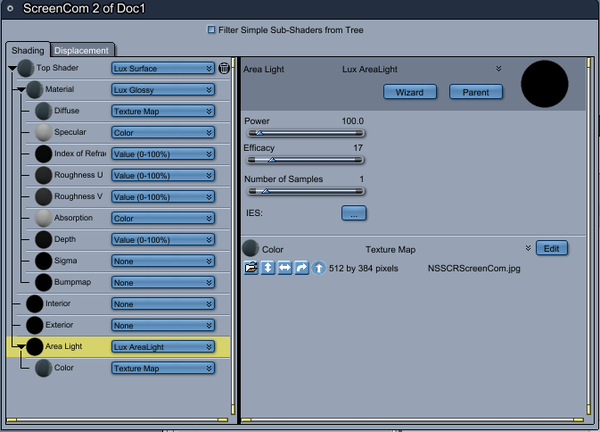 Then, I set up the texture on the small computer screen. I've done this a lot of different ways. With the Texture in the Area Light, in the Diffuse of a material WITH the area light, with the Diffuse of different kinds of materials but nothing in the Area Light. And this is about the closest I've gotten.