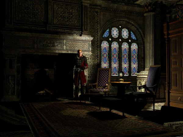 There are three lights in this: the outdoor, the lamp, and then a spot that I put on the character to bring him out. I had put a slight yellow tint to the lamp light, a slight blue tint to the outside light, and then left the spot untinted. I probably didn't tint them enough but I'm always worried about changing the tints of the lights too much because I'm color-blind and I'm afraid I'm going to push it to the unrealistic without realizing it. I'll amp them up next time.