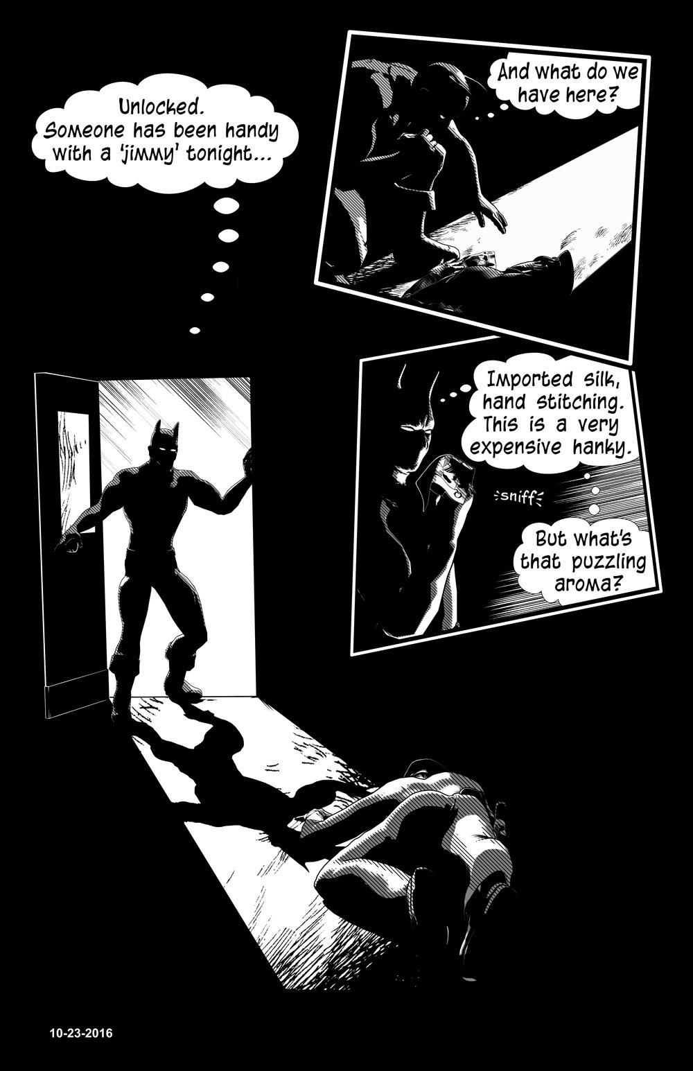 BTW: The hero is Moon Wolf, and yeah, he has more than a passing resemblance to a certain Bat-eared hero. Honestly, though, my inspiration for him more DC’s Wildcat and The Fox by Red Circle (aka Archie). Since this is just a fan project (done for learning software and workflow), I’m not in the least bit concerned about similarities to the Big Bad Bat.