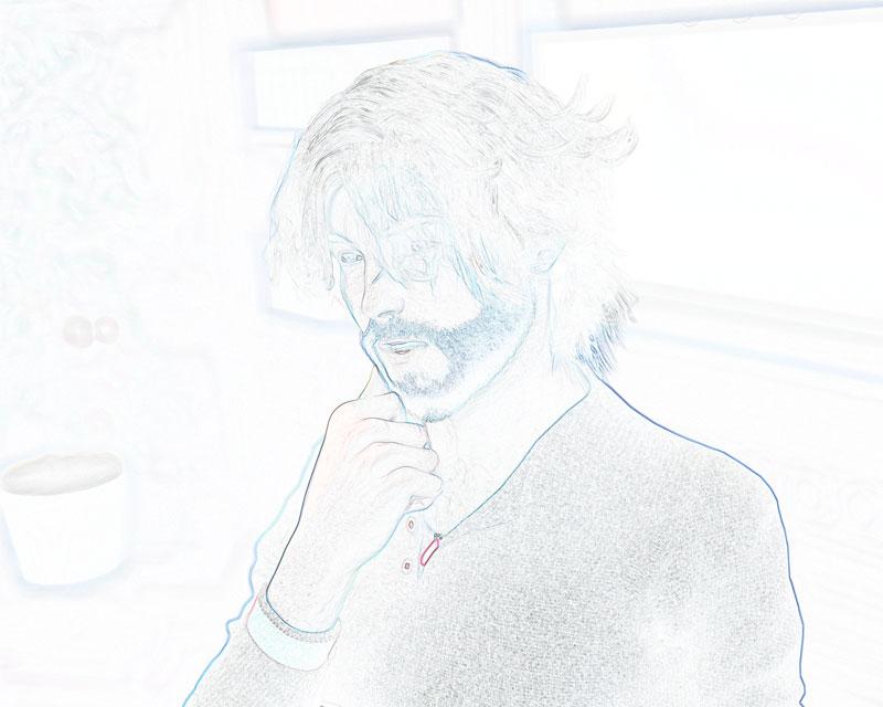 This layer, I duplicate and use the Glowing Edge filter and the Gaussian Blur filter on it. Then I invert the layer so that it's dark outlines on white ground. For other images, I also converted this layer to black&white, but for this one, I stayed with the original filter colours. I use blending mode Multiply for that layer, with lowered opacity (that one varies from image to image - in this one, around 60% works well).