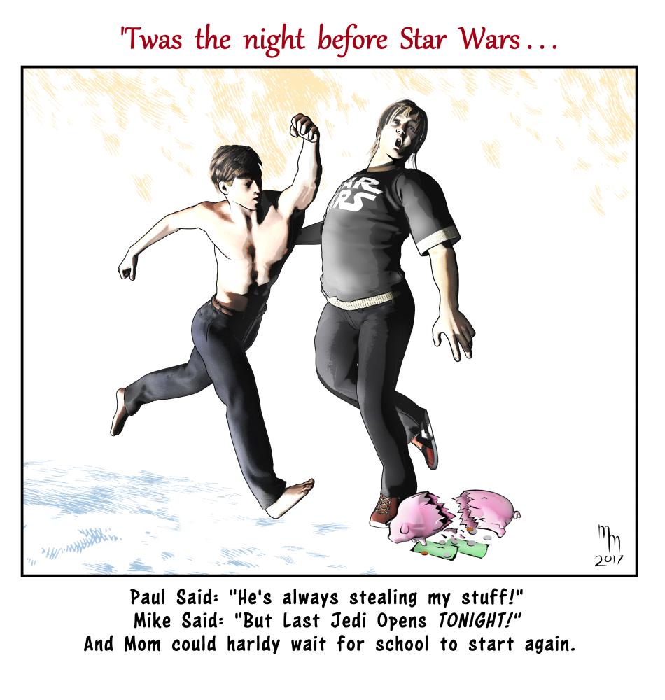 This second piece is, frankly, a mess. The background took forever to sort out and I think my treatment of the textures was just one bad choice after another. I do like the sky and the smoke lines, though. So, I kind of like the foreground and the background, but all the rubble should have been reduced to just shadows and shapes. To be fair to myself, though, I was trying to create a new style under a tight deadline and the work is good enough when I consider the time constraints and lack of guidance I had from the editor. Oh, and I was working in two different software packages (Poser and Daz Studio).