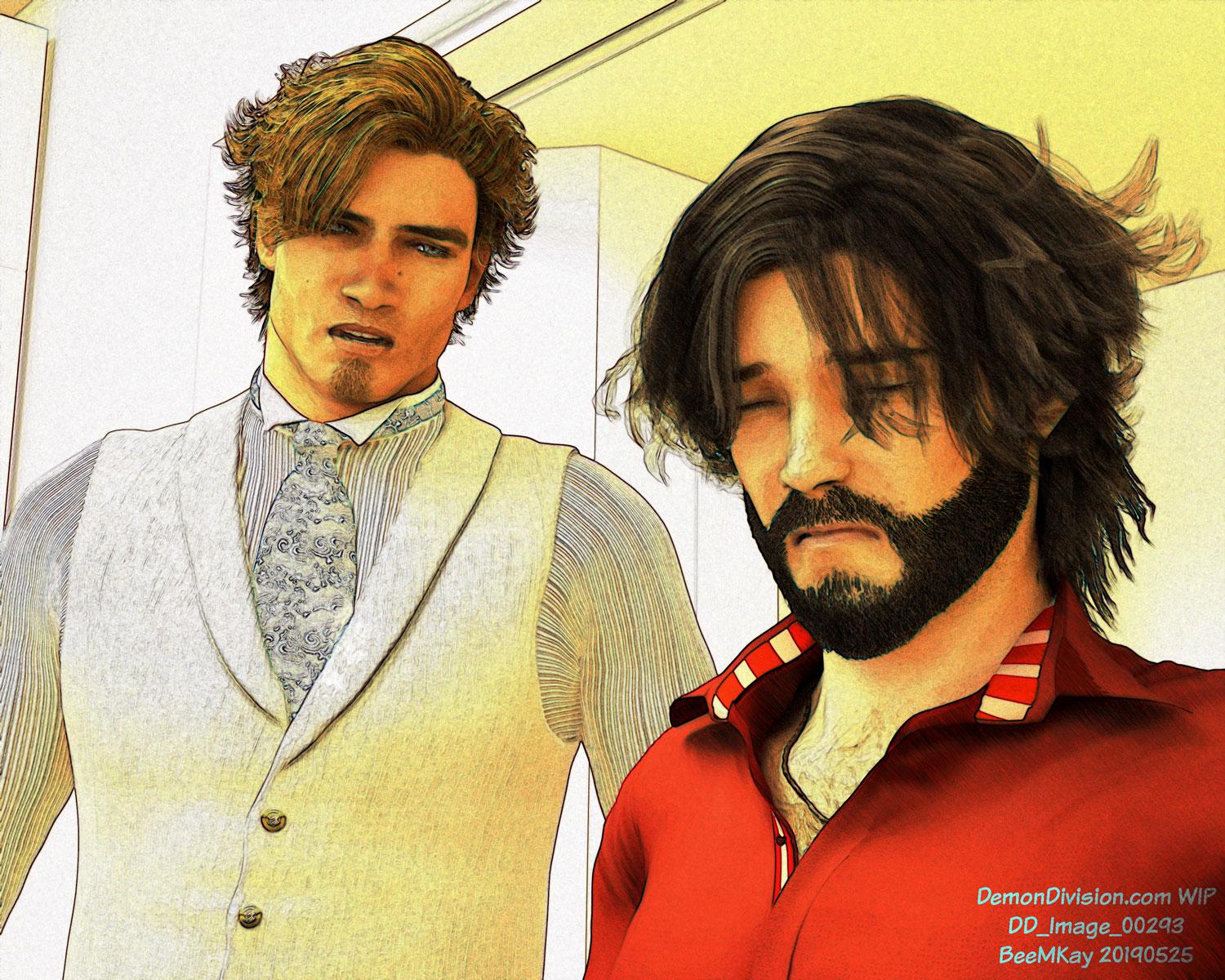 Just wanted to share this - it's a WIP from the upcomin page of Demon Division. I usually leave the rendered images "As they are", but the image below is for a flashback scene. It's edited in Photoshop, and makes use of the glowing outline filter and various blending modes.