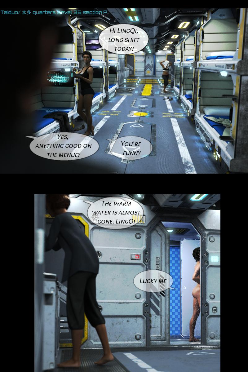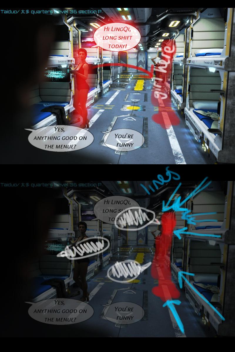 I like how the image two emphasizes the crammed-ness that is shown in image 1, with the total lack of private sphere. (Kind of reminds me of the Dwellers-part of my comic, as Hades also has rather limited resources, and is struggling with overpopulation, though it's not quite as bad as your premisen, as they have some rather cruel "traditions" that limit growth. Some of that will be shown in the chapter after Torque Mountain. Need to blow up stuff first.cheeky