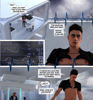 @BeeMKay - the changes you have made to your page are huge improvements. It has a better "read" and conveys a lot more drama. I agree with giselle regarding the dot at the end of the flatline. While it has a certain finality to it, it also ties into the fact that while Simon's brother (forgive me, I don't recall his name) is dead, the heart monitor machine keeps moving forward, as does Simon and the rest of the plotline. I think it's a wonderful element that conveys his death and at the same time shows continuing action. Just a really nice touch, in my opinion.