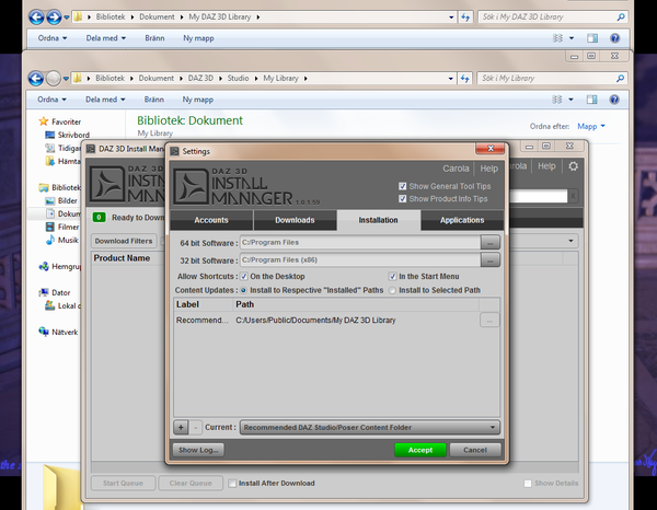 When I downloaded Daz I simply followed the instructions on the screen, same thing with DIM. Dim had it's specific recommended path and I honestly didn't thought more about it. Until today that is... when I realised that a item I bought had been installed in two different places, and that Daz could only reach one of those two...