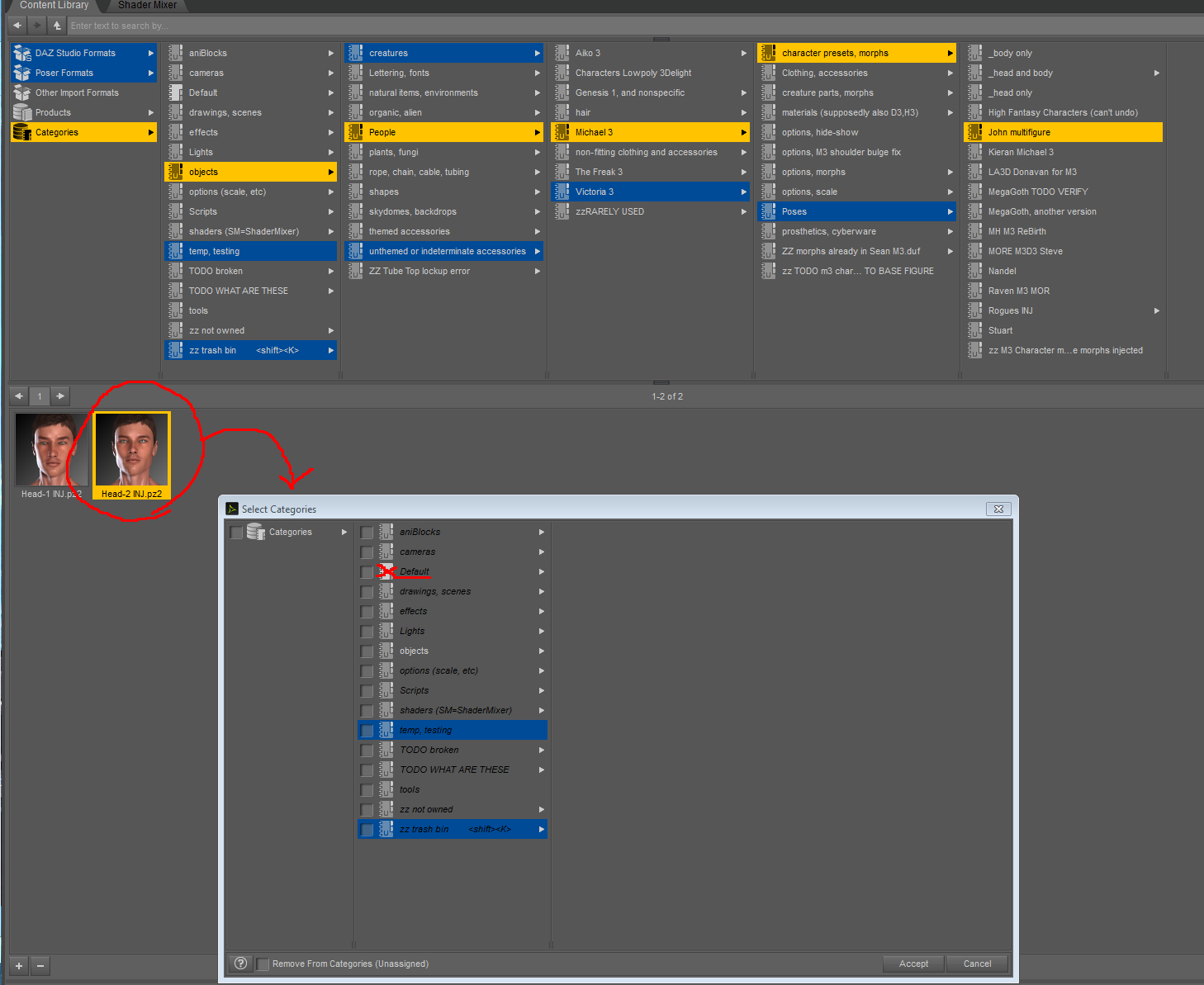 Customizing the content library to create your own custom categories and names is easy. Right-click on the content thumbnail, select Categorize from the mouse menu, then growse to whatever folder(s) you want to put them in, or create new ones. Note the custom content library folders you create will all be placed under the folder Categories, and you you can't modify the "Default" folder which is a special case. Other than that though you can do whatever you want.