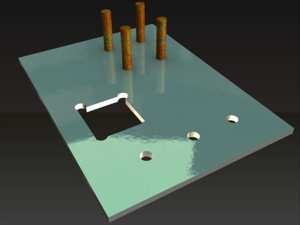 Here's an image of a hunk of metal made in Hex. I also installed three chromular framises in the holes. Inside the holes is a separate shading domain.