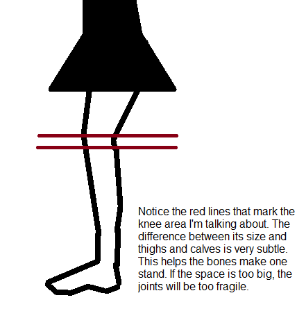 Her thighs are massive, but I'm talking about something different. I mean the difference in thickness is recognizable. When you see this photograph, the area around the model's knees is only slightly thinner than her calves and thighs. This makes the bones stable enough to make you stand, not to mention running. When early hominids started to move from trees to savannahs, this type of joint developed. If the space I mark red on the quick sketch I made (see below) is too big, the joints will be too fragile to hold you up.