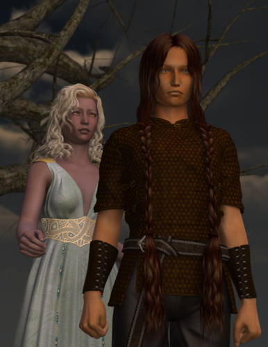 mori_mann, you've done a great job conveying their emotions. I wonder how it would look if you change the direction of Jerutha's gaze a bit...either he's looking slightly back in her direction (which might say that he's a bit conflicted), or else away from her, up and to the left (which might suggest he's being extra stubborn, maybe even trying to convince himself "I'm not listening!"). His skin does look a little orange-ish to me...maybe that's how he's supposed to look (being a member of a fantasy race and all), but if you want him to look a bit more natural, you could try shifting the diffuse color in a slightly green direction (see this post).