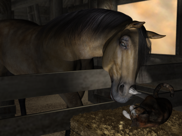 YESSS! What a difference. The cat really stands out, the tail was aligned against dark in the background, love your mouse (which proliferate barns! We have an opossum which frequents ours!) and I personally like the angle better, gets me more involved. It seems to capture the horse's subtle head movement, like he's moving his head toward us in response to the cat's playful poke. It's nice to see artists taking advantage of slight twists, bends, and turns to get the unique shot. Glad the peach worked out for you! One of my favorite colors. Next render (of whatever) see how you like mixing it with a pale blue spotlight- I love doing that. Congrats on your artwork!