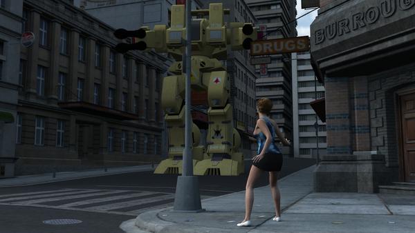 From the outfit of the woman you could guess she's on her way to a date, maybe to meet her boyfriend. The last thing she'd expect to meet is this huge warmachine, so she freezes in fear. The pilot of it just ignores the tiny pedestrian, for she wouldn't be not much of a thread for him.