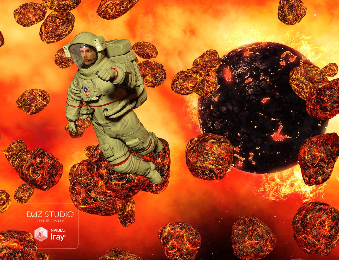 “Asteroid Belt 360” is the follow up to the “Moon 360” series! It combines asteroid props with 360 HDR environments. It comes with two circular asteroid belts an inner and outer set of props, these set come with morphs to randomize the look of environment. Plus, there are 15 individual asteroid props so you can customize it further. There are 5, Iray material presets with Blue Lava, Comet, Fire, Gray and Lava. Also, there are 4, 16K 360 HDR environmental maps, 2 come with prerendered asteroids so it will be a super quick render and 2 hand painted nebula sets with cool blue and fiery red. All in 16K resolution to give you a super sharp render. This is a must have for all your space and sci fi scenes. Works great with “Astronaut for Genesis 3 Male”. Please note this is a Iray based product.