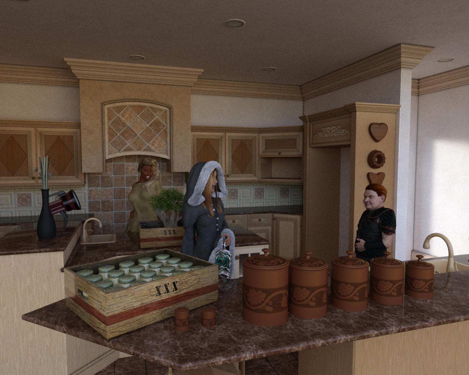 Judge Sarina Elfkin, Judge Jordon Small, and Judge Shandra Blacksmith decided to move in together because the house they chose was close to the courthouse. The fridge and stove was to come later on that afternoon with the rest of the boxes and stuff. At least they got a few things set up in the kitchen so far, like the canisters and the bonzi tree thanks to Shandra. Jordon didn't want to move anything too heavy because he had a bad back, but he was always telling Shandra and Sarina where he wanted things to go.