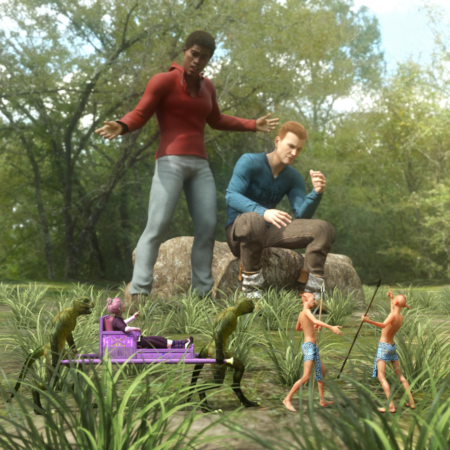Creating unique and believable poses is a lot of fun and easy to do, using Pose Blender. For this render, I combined partial poses and then tweaked her neck, hands and torso so that the fairy's body language appears respectul as she gently explains to the nature spirit her "side of the story" without leaning away or looking fearful. Previously It would have taken me hours to achieve a similar look without the script.
