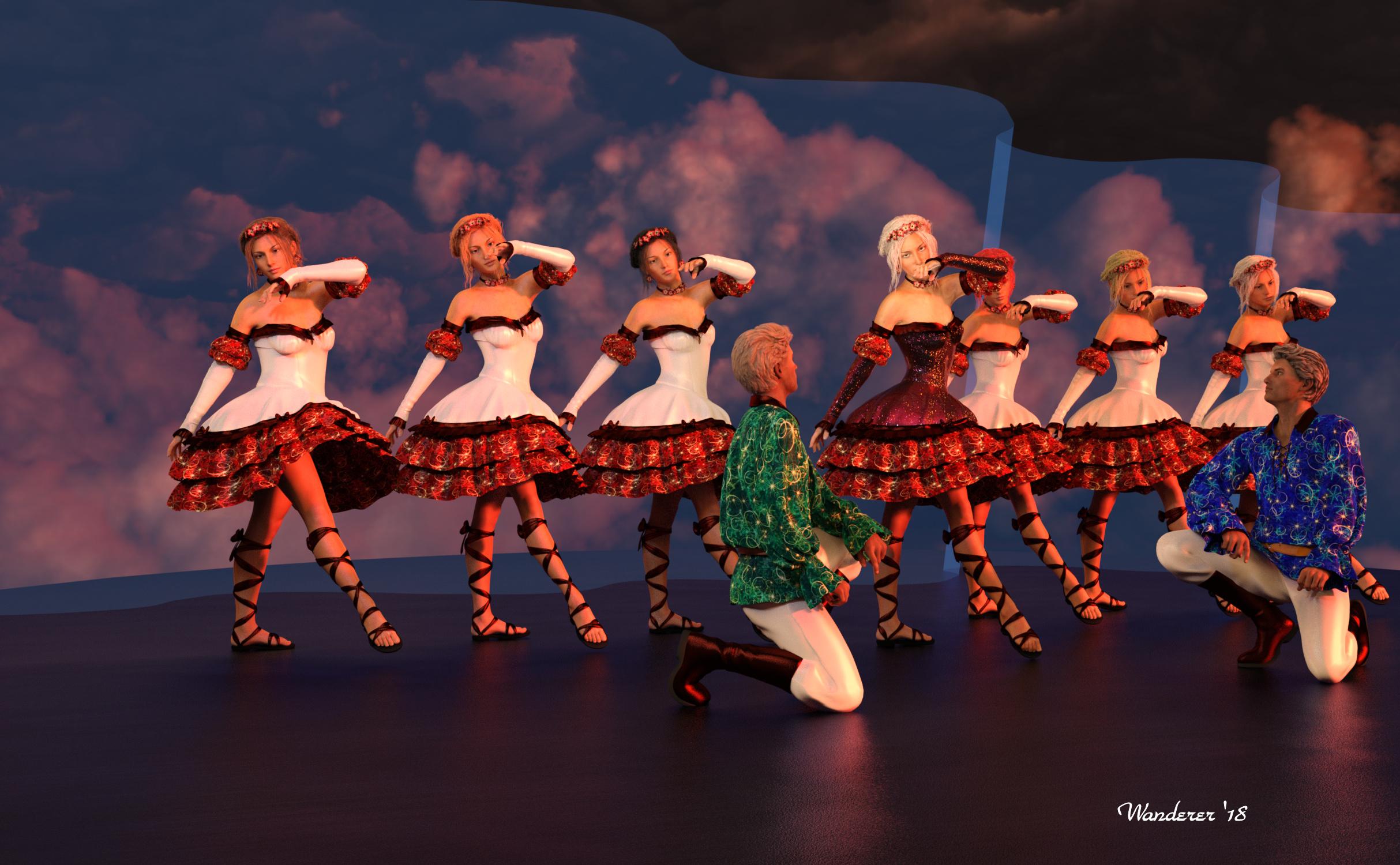 I've had a scene like this in my head for some time, but I was working toward having enough knowledge and skill to do it some justice. PR enabled me to focus on everything but the minutia of attempting to pose so many dancers with just enough variation to approach verisimilitude. In putting my entry together for this contest, I deliberately chose to minimize my resources to highlight the way Riversoft's product really shines. So, apart from cameras, lighting, and stage, inspired partly by this image, I've really only used two outfits (Hanami Outfit and Troubadour), two hairs (Fraser for G2M and Anjou for G3F), and two figures (G2M and G3F), with different textures to help make the illusion a little more believable. I think it turned out great, and Riversoft Art made it achievable with a lot less time and labor--and, I think to a much better end, than would otherwise have been possible.