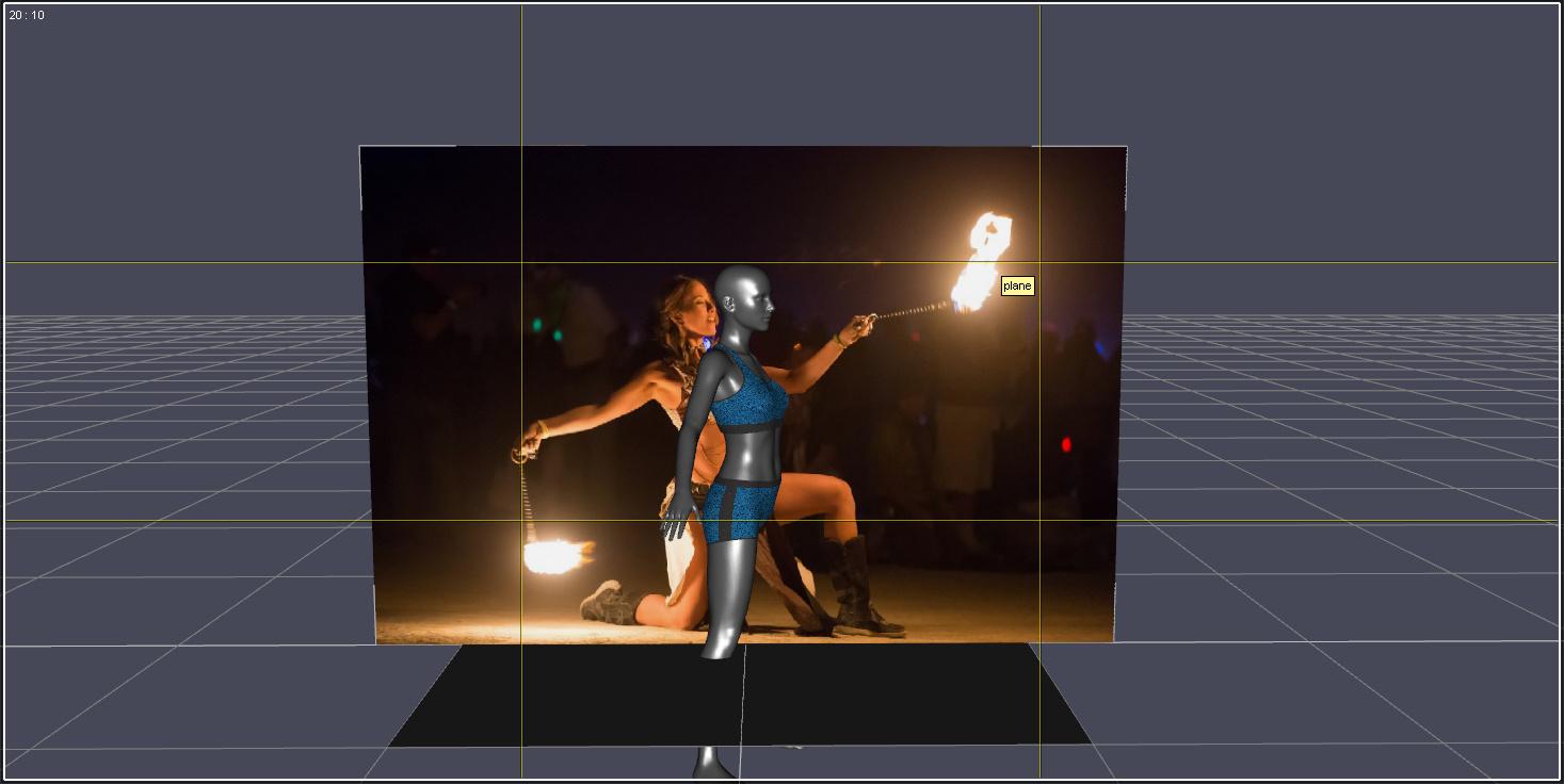 After posing the figure, I made the firedancer props in Anim8or (my first ever prop that wasn't just a primitive--even though really it is), and the fire I made in Curvy 3D, then applied Real Lights for Iray Campfire shader. After doing that, it fairly matched the photo reference. I was quite proud of it.
