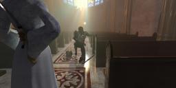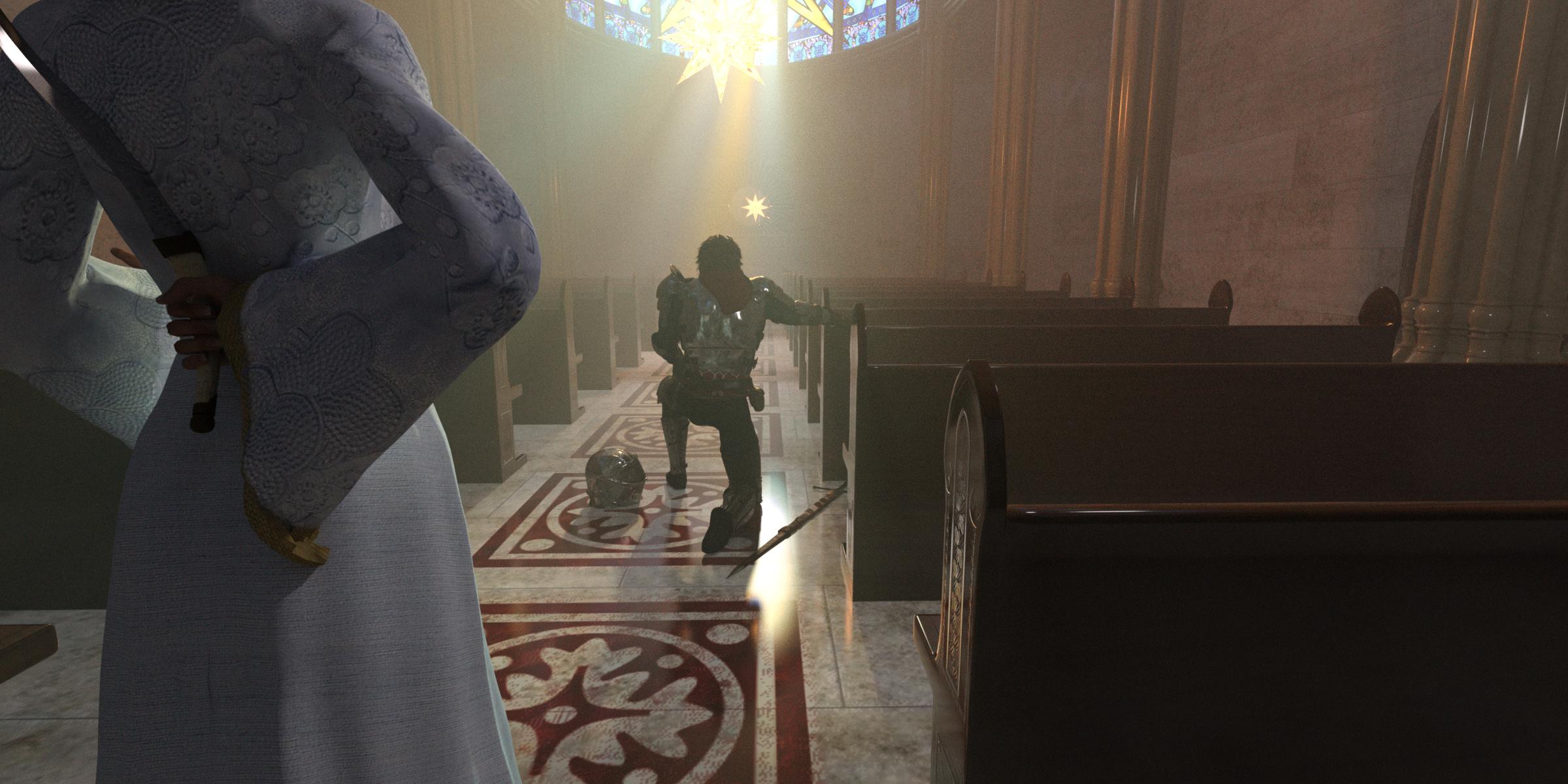 Overall both renders could use a bit more contrast to pinpoint the relavant bits in your image. for example the light reflecting on the floor in the church would be nice to have where the knelleing person is. LIght is always a method to lead the eye to where the interesting part is. Similar you could try to create a glinting reflection on the blade she hides, so we can notice the hidden danger.