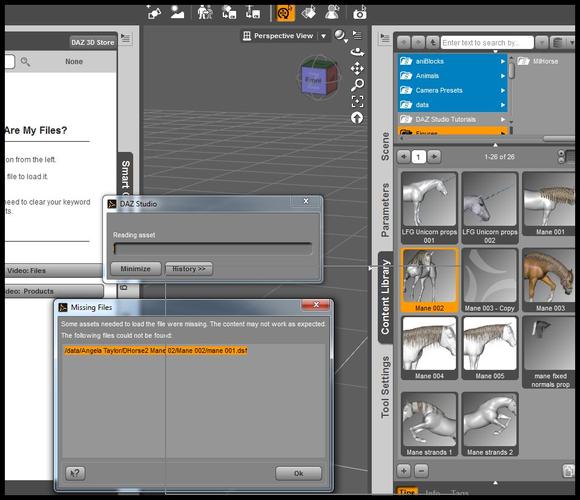 Hi Richard, thanks for the help, just tried again to load one of my mane models and it says "Some assets needed to load the file were missing. The content may not work as expected. The following files could not be found: / data/DAZ 3D/DAZ Horse 2/Base"