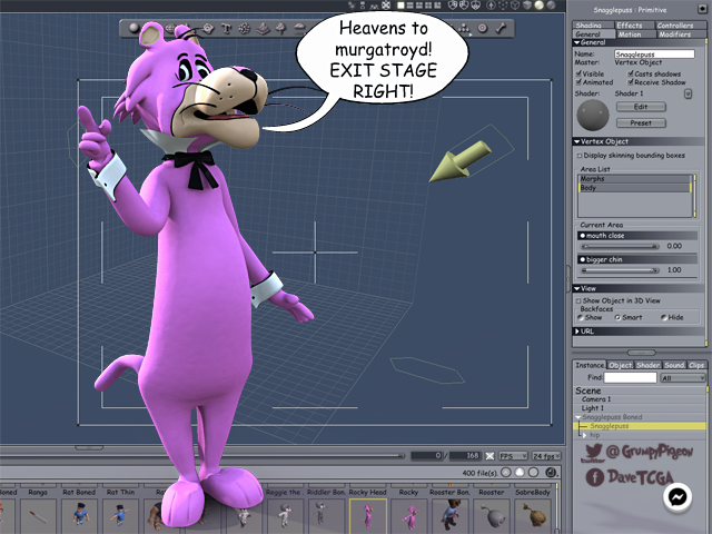 did some more on snagglepuss... made him a bit taller and added eyebrows and some morphs ... a PITA to weight paint though!