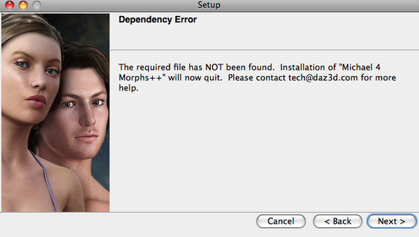 I hve only ever seen that error when the installer can't find the M4 figure installation. If you installed the M4 bas into a Poser folder somwhere, you will need to install Morphs++ into the same folder (it is all Poser content anyway). Any version of DS can see a Poser runtime folder if it is given the path in Preferences. Just make sure that the path is to the folder which 'holds' the runtime folder, and not the runtime folder itself.