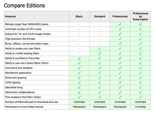 I don't know if anyone mentioned it, one cool thing about FF is with standard and pro you can make your own filters... if you upload them to Filter Forge's library and they receive a lot of usage, you can win points for free upgrades and if they are popular enough, you can receive free lifetime upgrades to future versions. It is not easy, but people with popular filters but people do earn them (two artists who I see post here- RawArt and Totte both have received reward points).