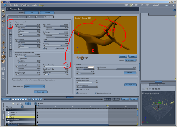 The Trunk tab 'Branch Quantity' slider is counted as 1 generation(afaik) in both the Tree Shape tab->Ramified Thrsld. and General->Generation Count sliders(Carrara 8.5 Pro beta 204).