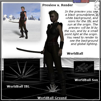 The WorldBall is a Poser prop, the IBL is a Diffuse IBL light, and the sun is a distant light. The default GROUND prop is used.