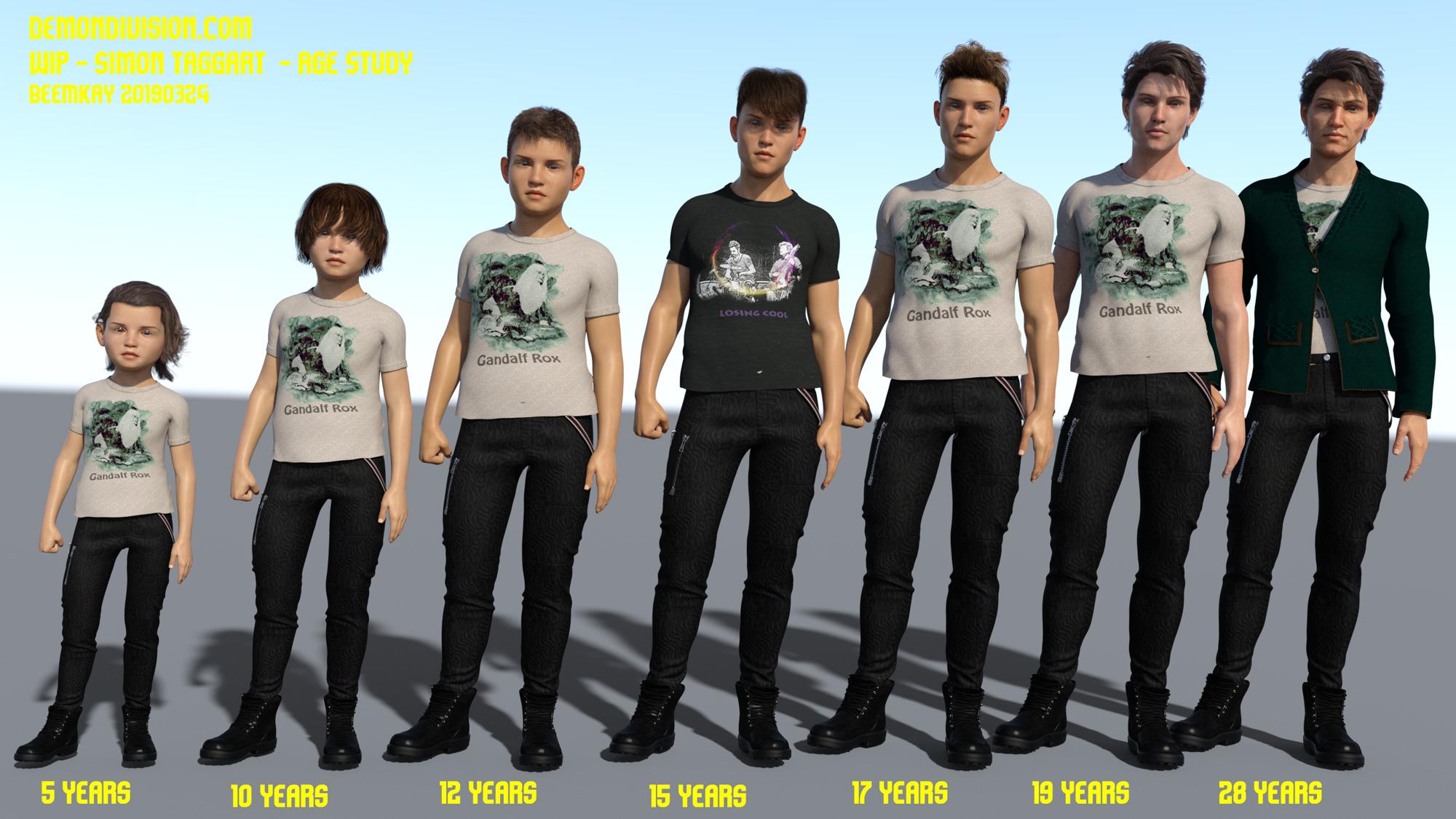 The other issue is getting the scale and proportions done right. Simon is using G3M as a base, and there are several products that can be used to age a character, or make them younger. The one I mainly used is "Growing up", but then I had to dial out most of the character body shaped that define the more adult versions of the character, because of things like muscle mass and definition.