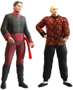 Here's the first test render (gotta love overnight ones...). It will need some work in the setup, though, as there's some intersection, poke through and the belts misbehave (and levitating butt in the image from the other side), but I think the characters themselves turned out really nicely! I'm quite happy with it in general.