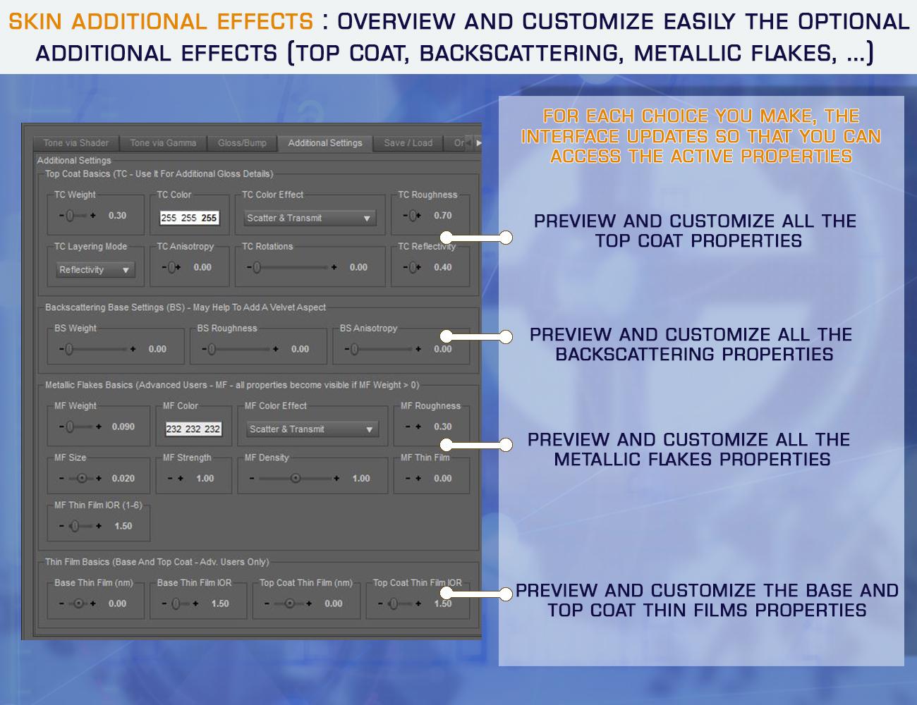 Unique save, load and transfer tools are also included : at any time during your skin shader adjustment, you can save in text files presets of properties without leaving the interface, so that you can load them later on, during the same or another session, on the same or on another figure. Even better you can load such presets on any Generation, and you can load only the properties you want. An additional script is provided to transfer your new shaders on the genitalia of your figures.