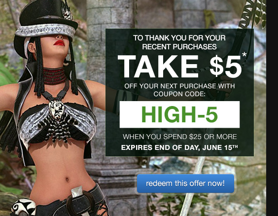 The HIGH-5 coupon seems to have been set to expire too early, on Friday instead of Saturday. It has now been extended to cover the rest of the weekend, though I'm not sure whether it will expire at the end of Sunday or the end of Monday. Thanks to the DAZ people who fixed this at the weekend.