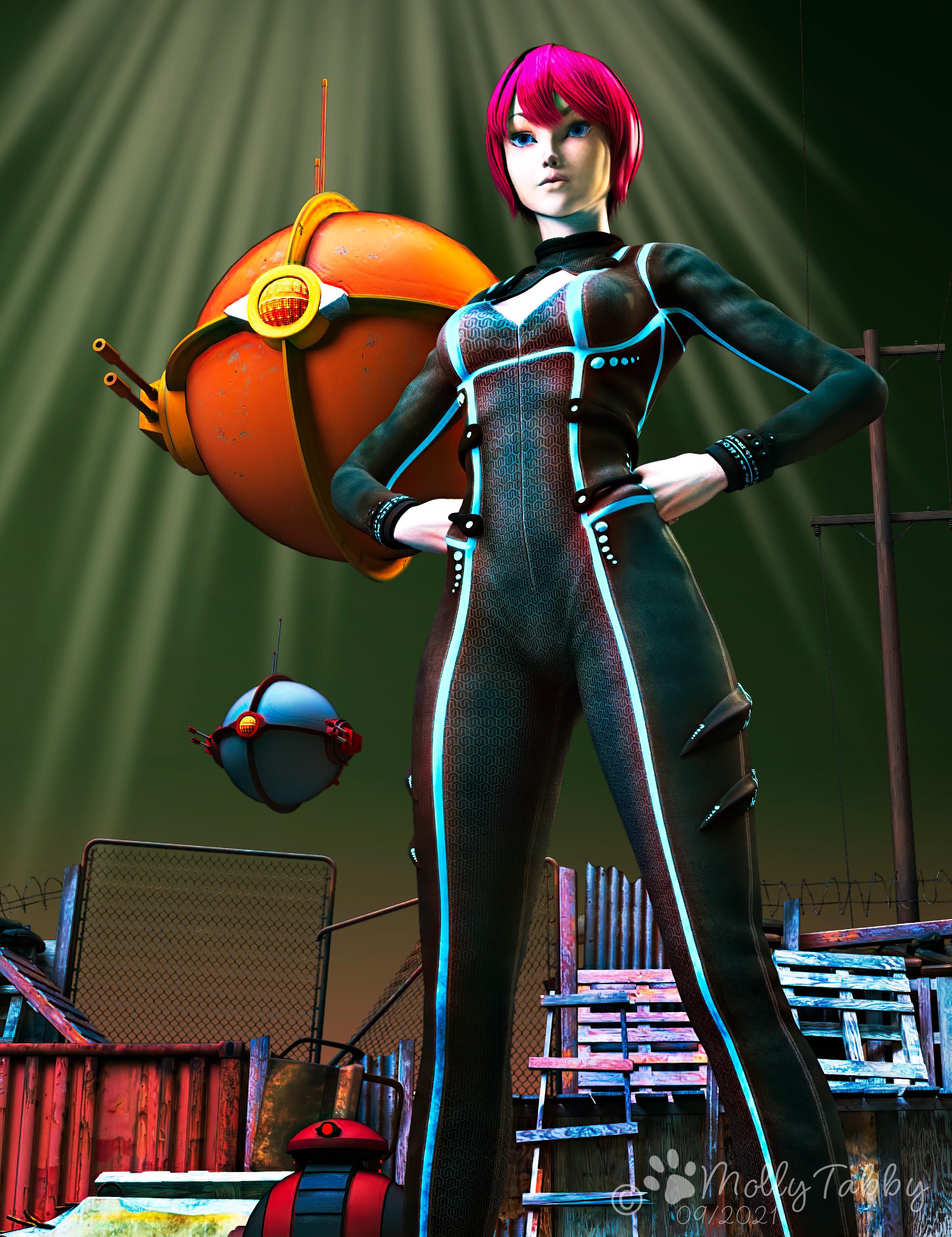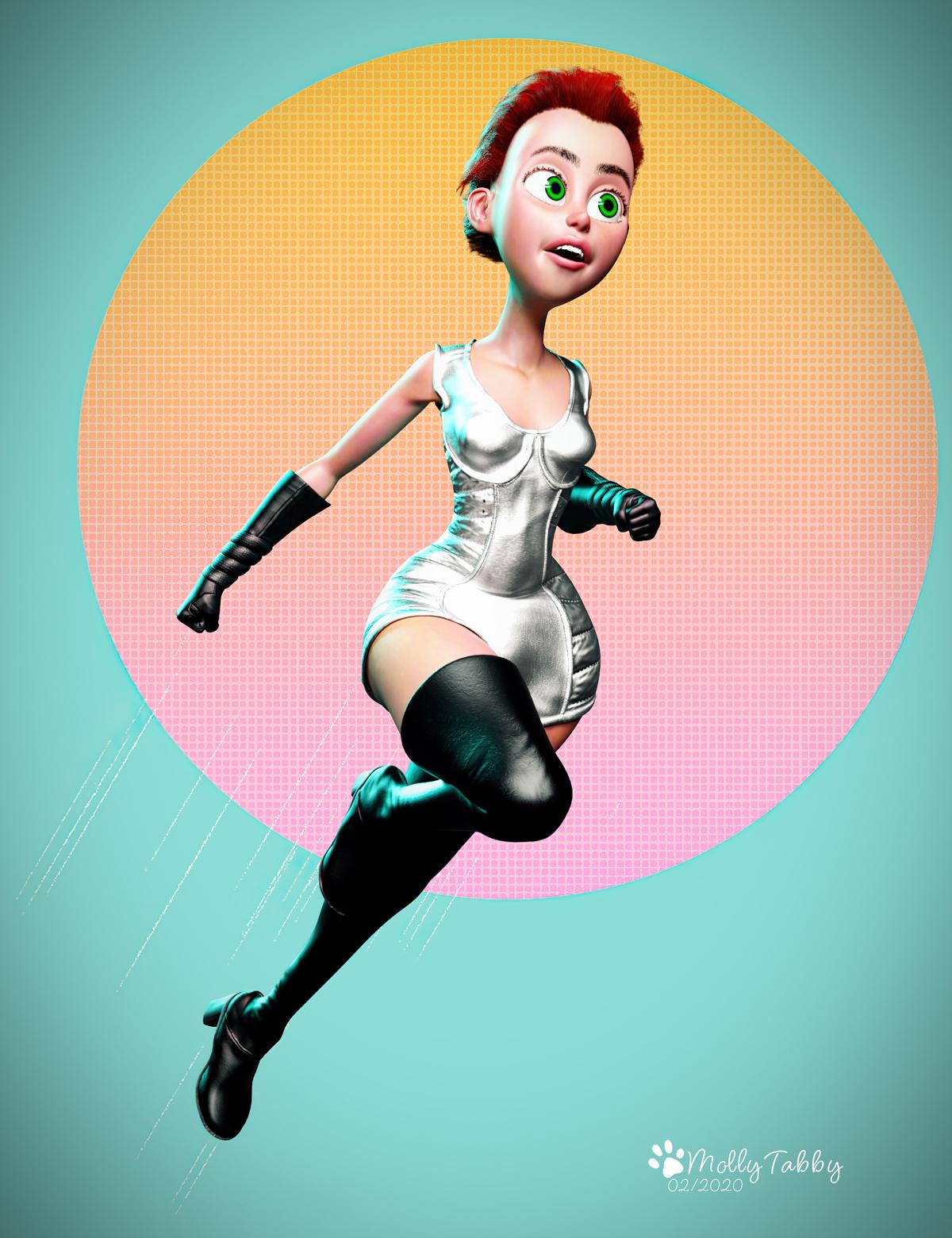 A render using the new Toon Mom from Joe Quick. The outfit is SciFi Pinup Outfit for Genesis 8 Females and the hair is Shock Hair for Genesis 3 and 8 Females,  both by the3Dwizard. Postwork in Photoshop and Topaz Studio 2.