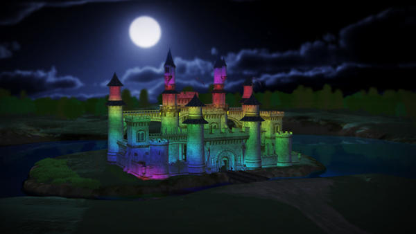 My grand daughter wanted the castle to have rainbow colors. So, I immediately considered I could use a light gel on a spot light and some compositing / rotoscoping in Adobe Affect Effects to get the look I wanted. However, iClone does not support light gels (not in the way Carrara, Maya, Lightwave, etc. do). So, the establishing shots with the rainbow castle were rendered in Carrara (opening shot, night time castle shot, and shot before king's messenger reads). The rainbow color was composited in After Effects on any iClone shots that included the castle.