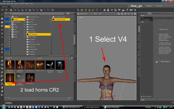 1: Go to the Poser Formats > My Library (if that is what your content folder is called) > Figures > Daz Characters > V4 Creature Creator and load two Horn CR2's.