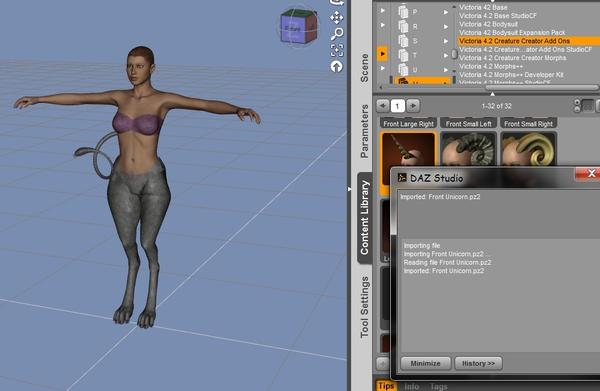ok.. Gang.. I've got a different problem.. I've had Michael and Victoria 4.2 Creature Creator Add Ons for about 6 months now.. and I STILL can't get the RAM, UNICORN, BULL.. etc.. horns to rez. As you can see by the photo below.. it says it's importing them.. but they never show up. I thought it was just me... but I've been working with DAZ for over 6 months now and I know how to pull things from my inventory... I even tried in poser.. and they simply won't rez. I'm veeeeeeery frustrated... HELLLLLLLLLP!!!