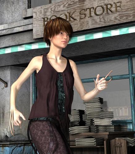 Dark Elf Rogue refitted to Gene-02F including the hair and yea, the boots which look perfect. MallenLane did a superb job as creating a very good template for transfers! Also using my body morphs and face morphs as well as flight pose.