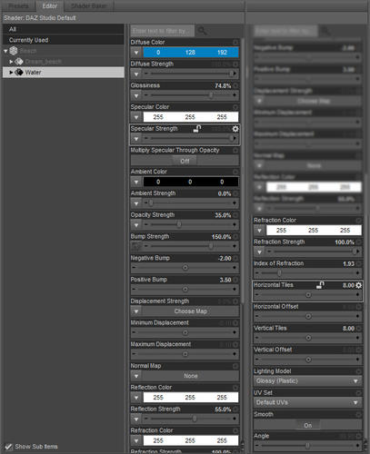 Thanks. The setting is AzimX's AX Beach, which includes a water texture; I took the texture out of the diffuse channel but converted it to grayscale, plugged it into the bump channel, and increased the tiling. Screenshot of my material settings attached.
